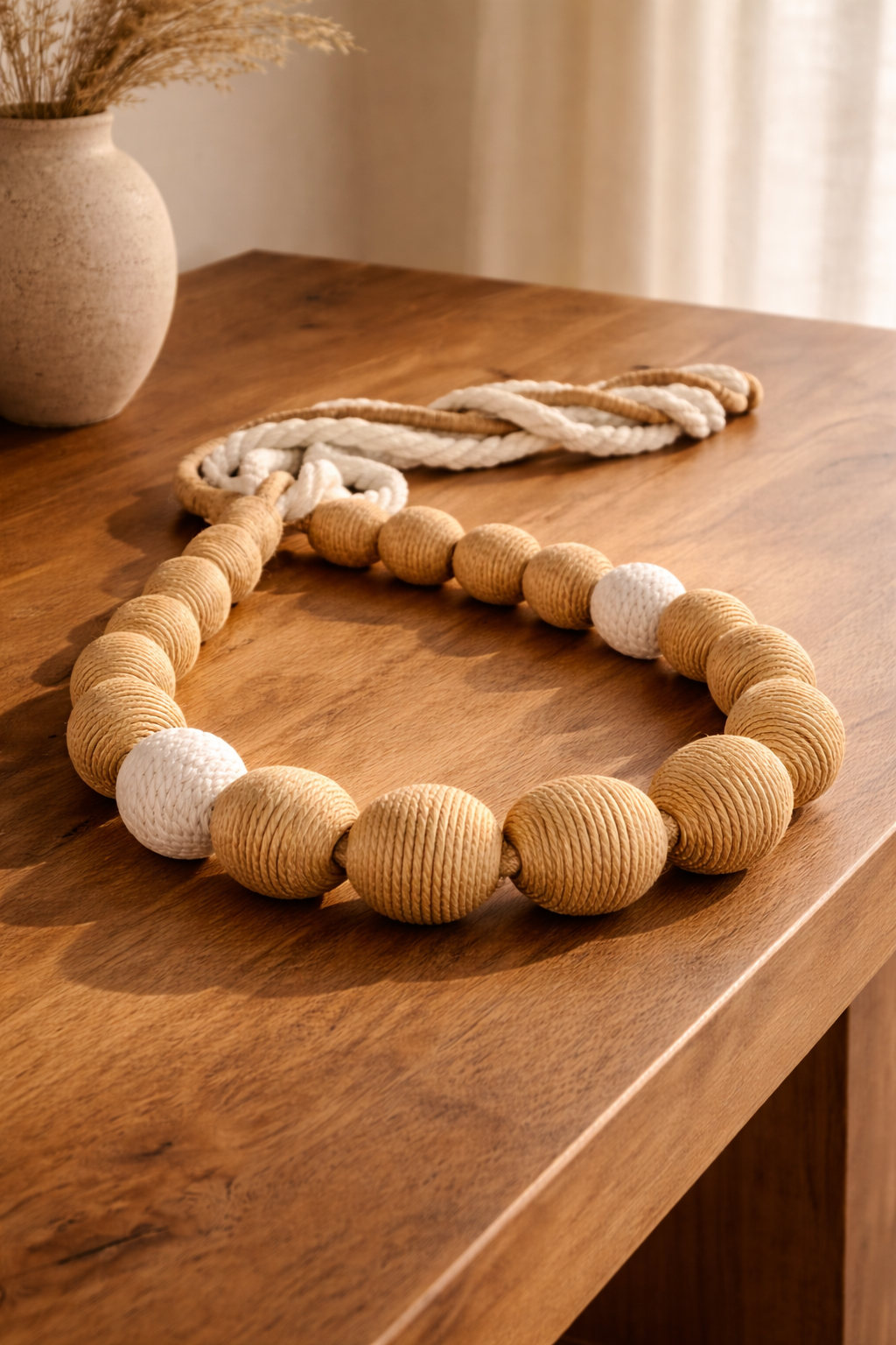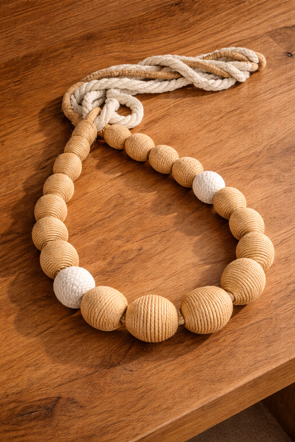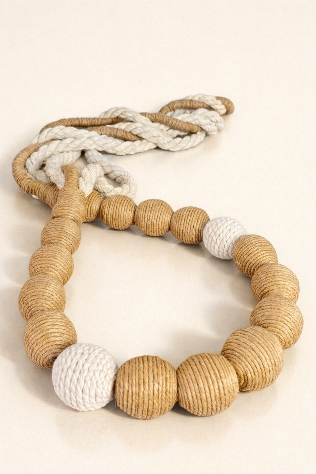 Material: Contas revestidas com fios de juta e algoão.