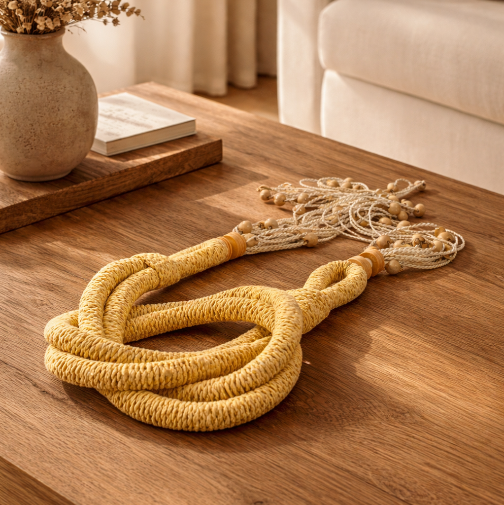 Com tonalidade quente e presença marcante, ele introduz cor de forma sutil e natural, como o sol que atravessa a paisagem ao fim da tarde. Feito à mão, com fibras naturais e elementos orgânicos, mantém a essência artesanal da coleção, agora atravessada pela luz.