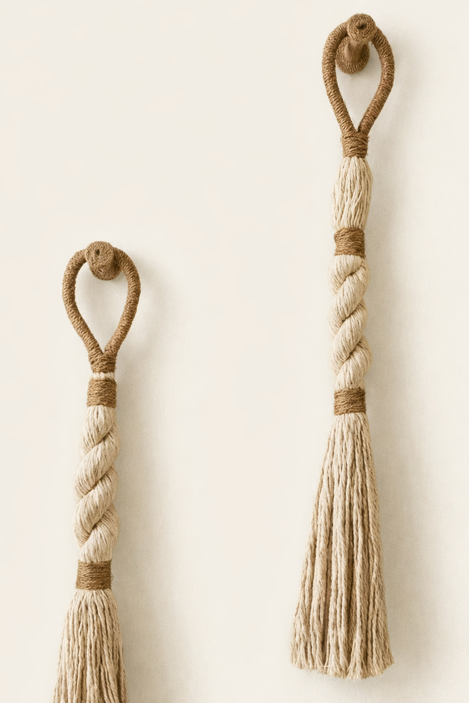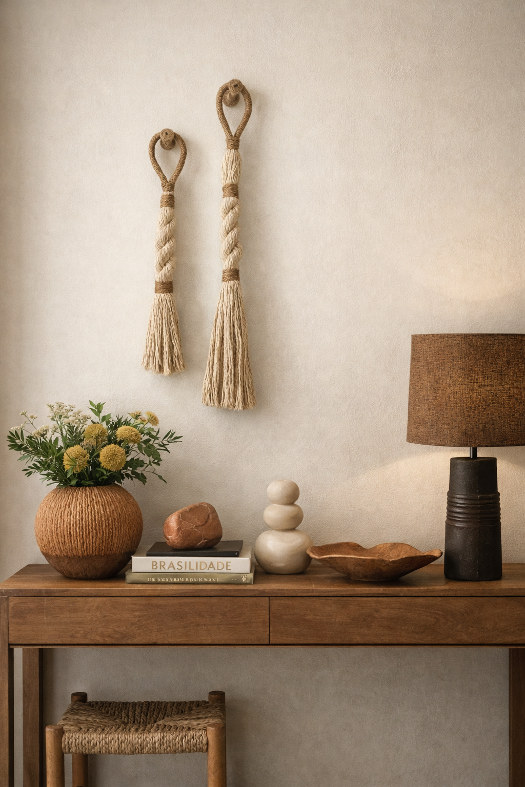 Com estrutura vertical, torção marcada e acabamento em fibras naturais, ele evoca amarração, ritual e permanência. Feito à mão, carrega o tempo do fazer e a força do nó como símbolo de encontro e continuidade.